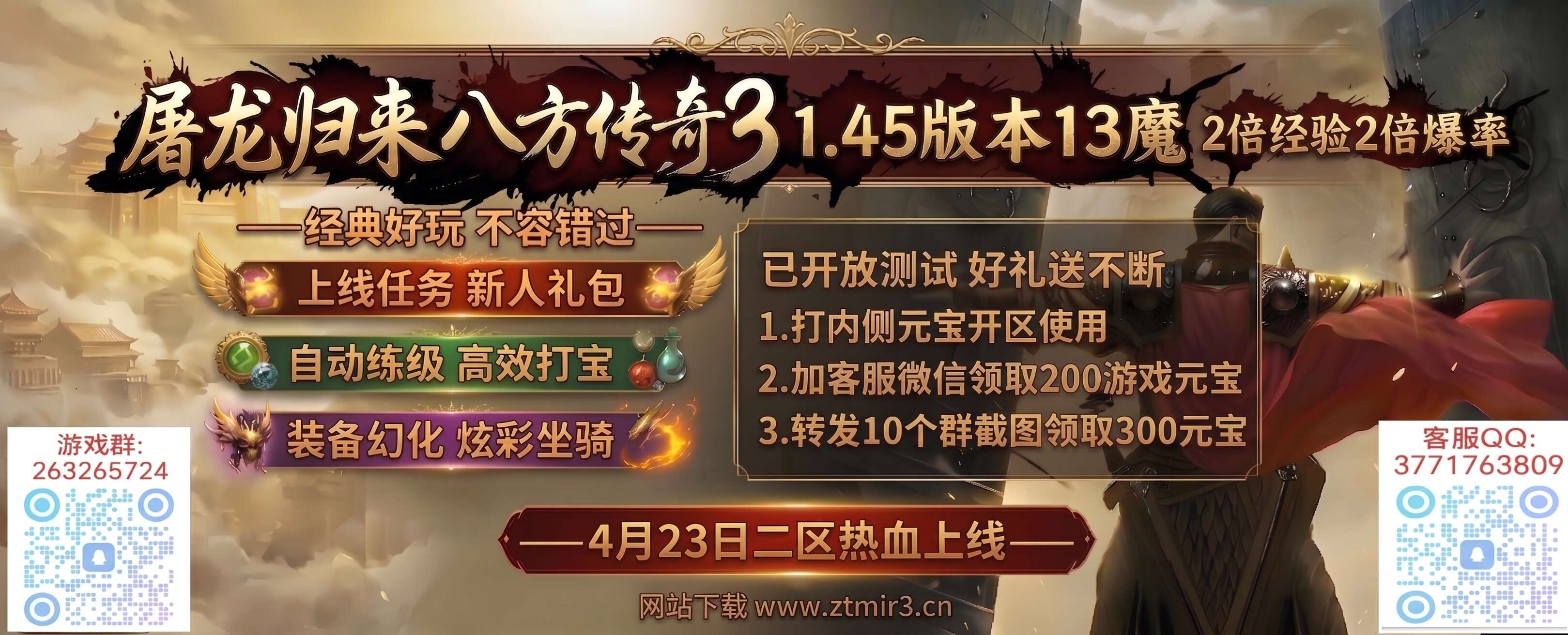 | 首区情怀首爆奖励13魔4倍服 | 04月20日内测 04月22日开区 | 中国多线 | 13魔 | ★极品多多情怀复古★ |